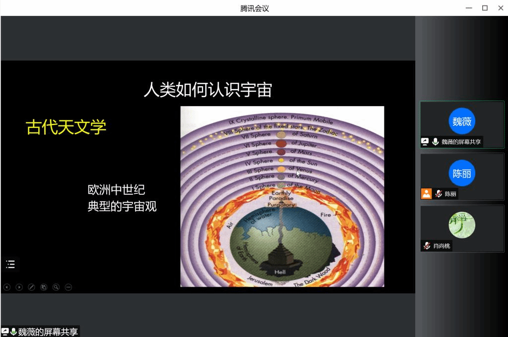 从“地心说”到“日心说”,从半定量研究到严格定量研究,魏老师带领同学们回顾了人类认识宇宙的历史,仪器越来越精密,人类对宇宙的认识也越来越深入。魏老师还提出了许多宇宙中的未解之谜,鼓励同学们发散思考。