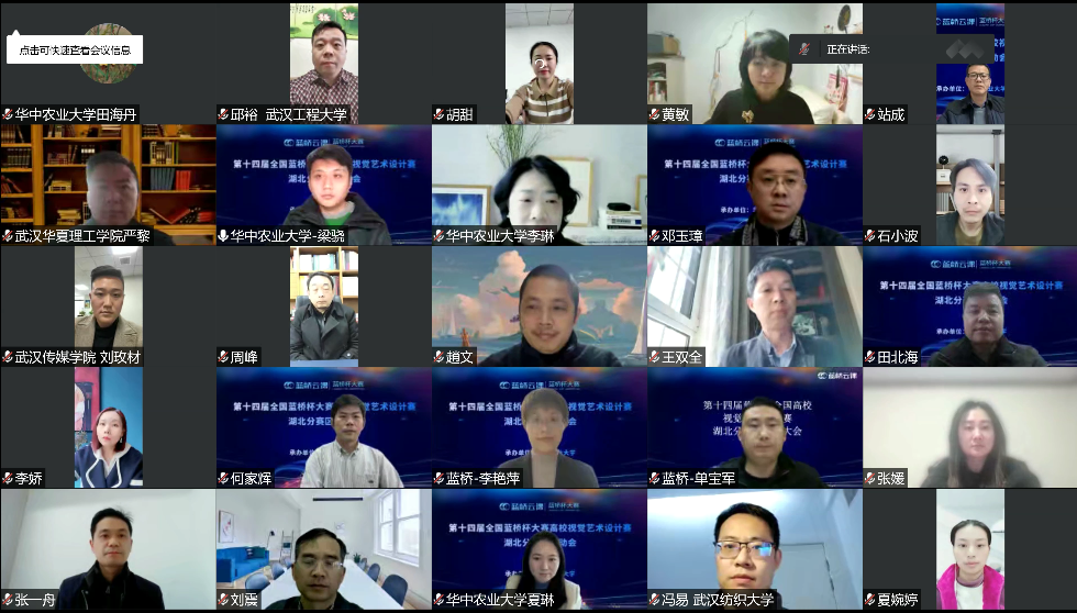 (文孟嘉钦)2022年11月28日,由“蓝桥杯”组委会主办、太阳成集团tyc33455cc承办的第十四届“蓝桥杯”大赛视觉艺术设计赛湖北赛区启动会在线上圆满举行。本次会议邀请了湖北省各院校教学院长、系主任、分赛区专家委员及大赛指导教师共同探讨“蓝桥杯”大赛视觉艺术设计赛的备赛经验。会议由太阳集团tyc33455艺术设计系梁骁老师主持,太阳集团tyc33455瞿明勇书记、田北海院长以及艺术设计系全体教师参加了此次会议。