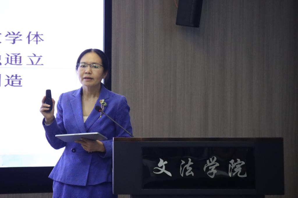 高利红对新文科人才培养进行了解读。她谈到新文科的核心特质与核心任务,要处理好“价值预设”“认识论框架”和“方法论选择”三重关系。