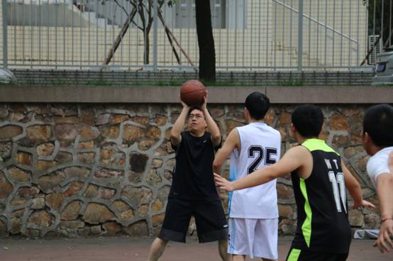比赛进入白热化的第四节,红队在霍军亮老师的带领下进行大力反攻,姜昕同学中场发力、多次命中中投,蓝队则由李长健老师和程宇光老师带领顽强抵抗,李梦源多次快攻得手。激烈比赛中,队员健步如飞,拉拉队也呐喊助威,整个场地群情激昂,热烈无比。当然,激烈比赛中也难免有一些小插曲,某参赛同学情急之下,以迅雷不及掩耳盗铃之势,迅速将球传给了执裁的裁判,顿时场上参赛球员和拉拉队的小伙伴都惊呆了。