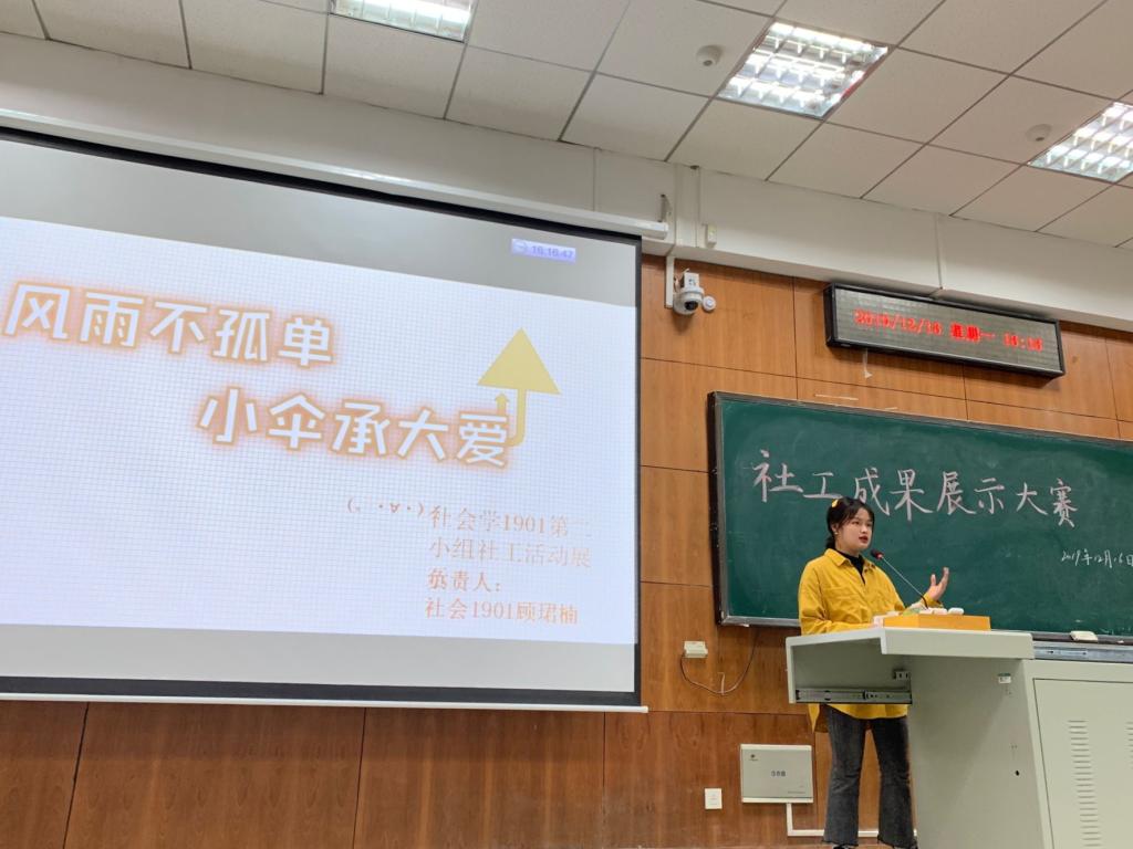 12月16日,太阳集团tyc33455社会学类19级社工成果展示大赛在三教A105教室举行。来自社会学类的十个社工小组,向师生们展示筹划一个多月的社会工作实践作业成果。社会工作系陈红莉、黄蓉、马威、许彩丽四位老师及辅导员张帆出席并担任评委,并有十名同学担任评委。