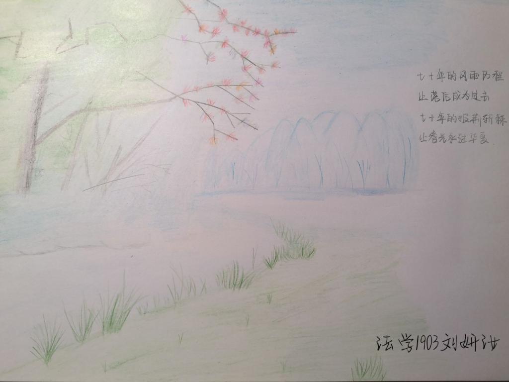 法学1903班宋欣然想对祖国说,愿以我辈之青春,护我盛世之中华。法学1802班的徐小静同学分享了一首名为《微微》的歌曲,她表示,白衣天使就是每一个微微,在平凡中造就大义,社会离不开这无数的微微,实现自我,救赎他人,微微的力量再也不微小。法学1903班的刘妍汝也用一幅画表达了她对祖国的祝福,画中近处是青葱的树木和灿烂的花朵,远处是山河,七十年的披荆斩棘,会让春光永驻华夏。