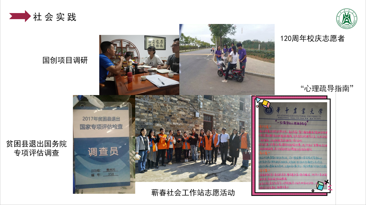 在造就品性、成就秉性和练就韧性的过程中,金芬时刻勉励自己将奉献的本性融入到“立己达人”的校训精神和社会工作助人自助的理念中。2017年贫困县退出国务院专项评估调查中,金芬前往贫困地区,扎根基层,完成近一百五十户贫困户评估;在国创项目中,金芬与队员共赴湖南和四川,对国家重点发展的康养组织进行调研;在此次疫情中,金芬也响应着习总书记对广大社工的号召,运用专业知识为他人疏导情绪。