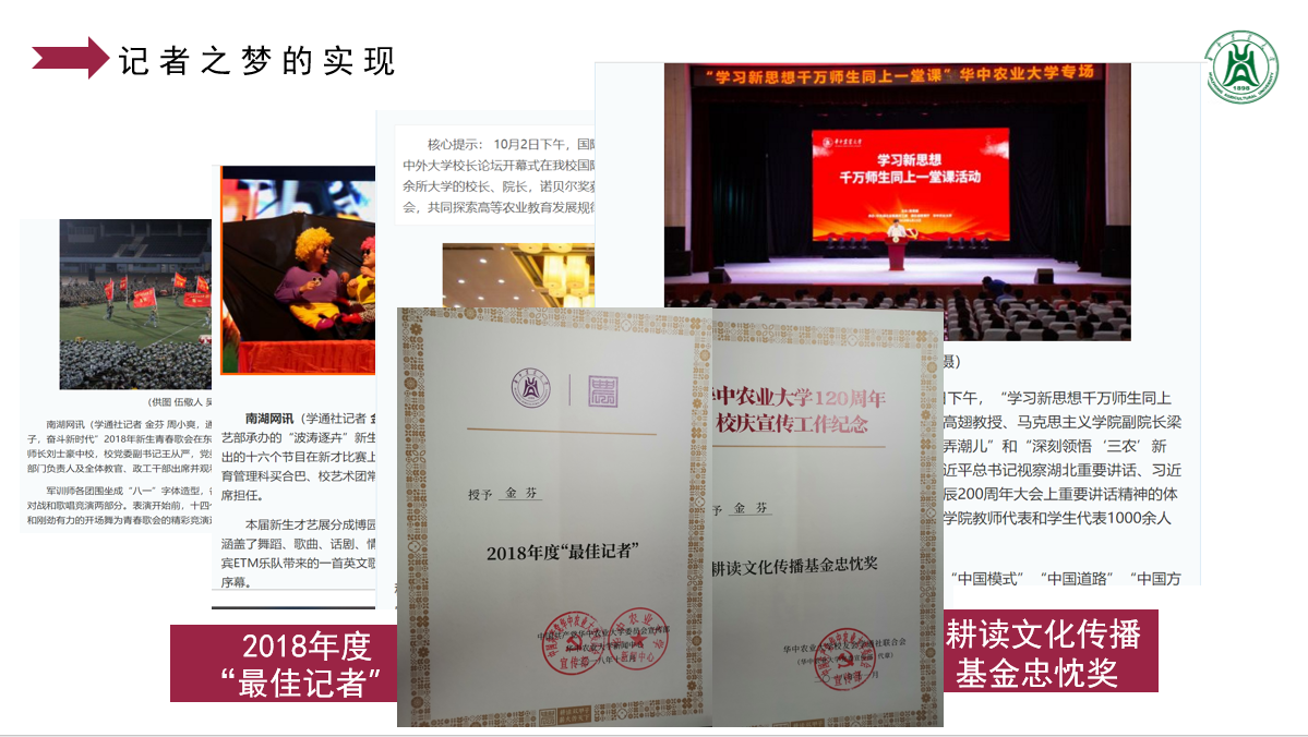 磨难造就成功,也造就了“血性藏獒”金芬。在两次校级赛事中,金芬的队伍成功完成从排名倒数到第四名的飞跃;数不清多少次在困意袭来的深夜里改稿,金芬将心力化为笔力书写着华农的青春故事,才使得她荣获2018年度“最佳记者”称号,在校内外媒体刊登了十余篇稿件。对困难的不低头,是金芬“King芬精神”的藏獒韧性。