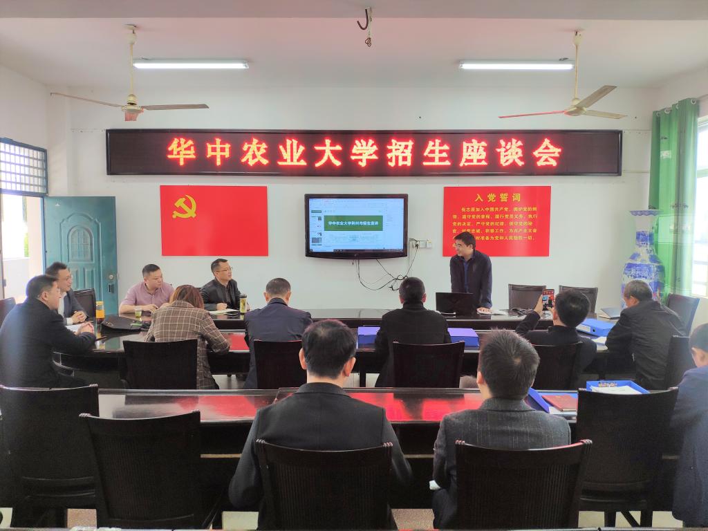 周治瑜一行先后走访了松滋一中、公安一中、石首一中。在座谈会上,本科生院招生办公室主任张进向当地老师介绍了学校的办学历史、校园环境、办学规模等情况,并从教学体系、师资队伍、学科特色及国际交流等方面介绍了我校的人才培养情况,同时结合学校牵头组建“洪山实验室”、“两季三节”校园文化活动等,介绍了我校的科技实力和校园文化建设。张进还对新高考改革背景下学校的招生政策进行了解读,对湖北省“院校专业组”志愿填报模式下我校的专业组设置及选考科目要求等进行介绍,并分析了我校近三年在湖北省及荆州市的招生录取情况,给出填报建议。