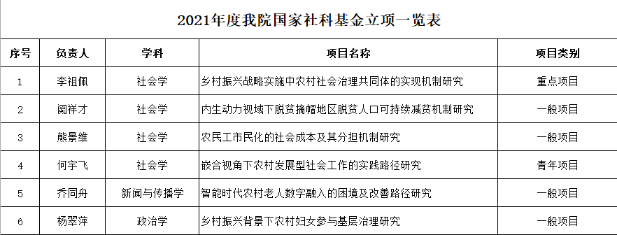 近日,全国哲学社会科学工作办公室公布了2021年国家社科基金年度项目和青年项目立项结果,我校共有16个项目获得资助,我院占有6项,其中唯一1项重点项目由我院李祖佩老师贡献。