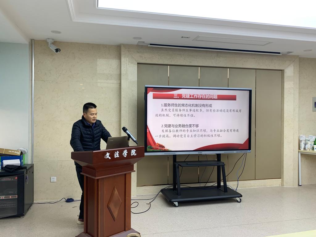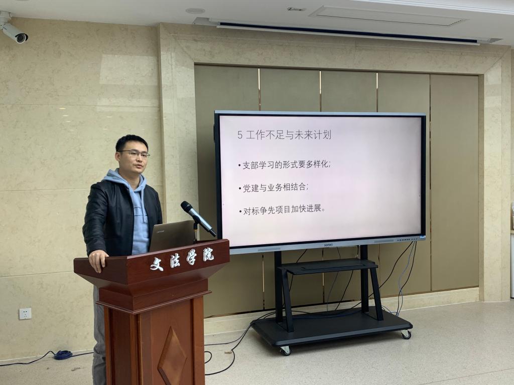 行政教工党支部书记孙站成介绍了支部坚持“党建+服务”融合发展理念,以建党100周年暨党史学习教育为主线,以“我为师生办实事”为落脚点,用实际行动助推学院核心工作有序进行。