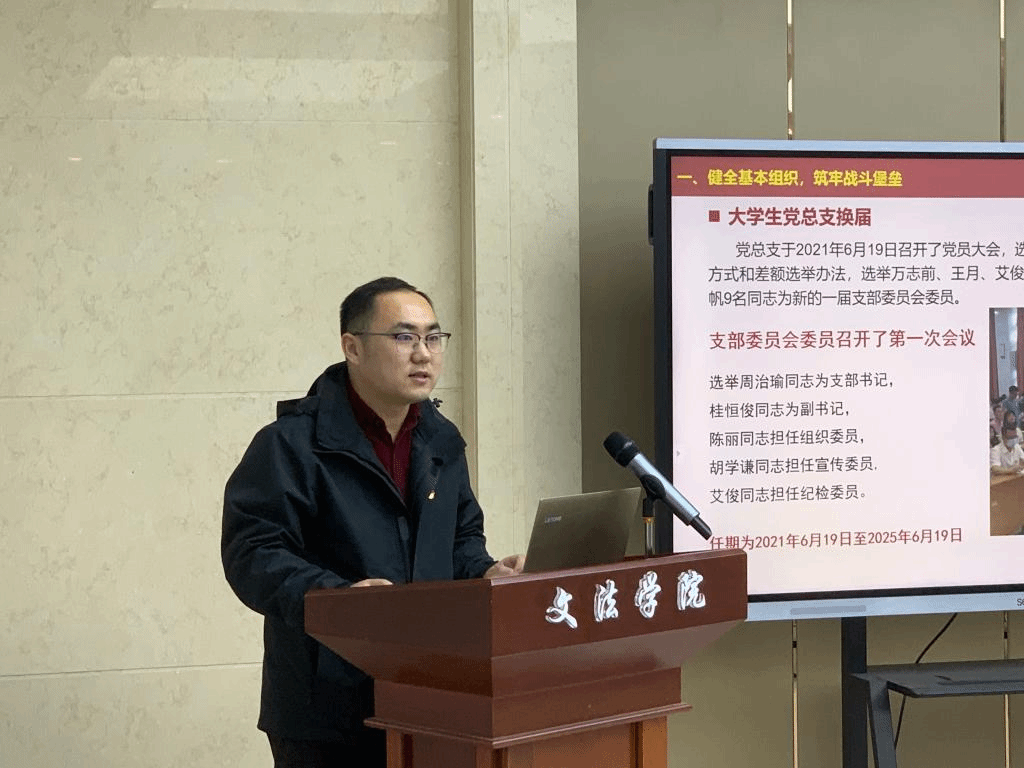 大学生总党支副书记桂恒俊汇报总支部围绕健全基本组织、贯彻基本制度、建强基本队伍、开展基本活动、强化基本保障五个方面,系统提升学生党建工作质量的做法和成效,分析了学生党建工作中存在的突出问题和解决思路。