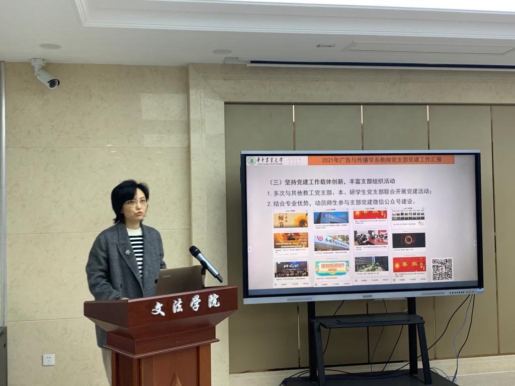广告与传播学系教工党支部书记聂祎介绍了支部搭建党建工作平台,创办的微信公众号“狮曰”,宣传党的路线、方针和政策,展现师生实习风采,加强老师与学生互动的一些探索实践。