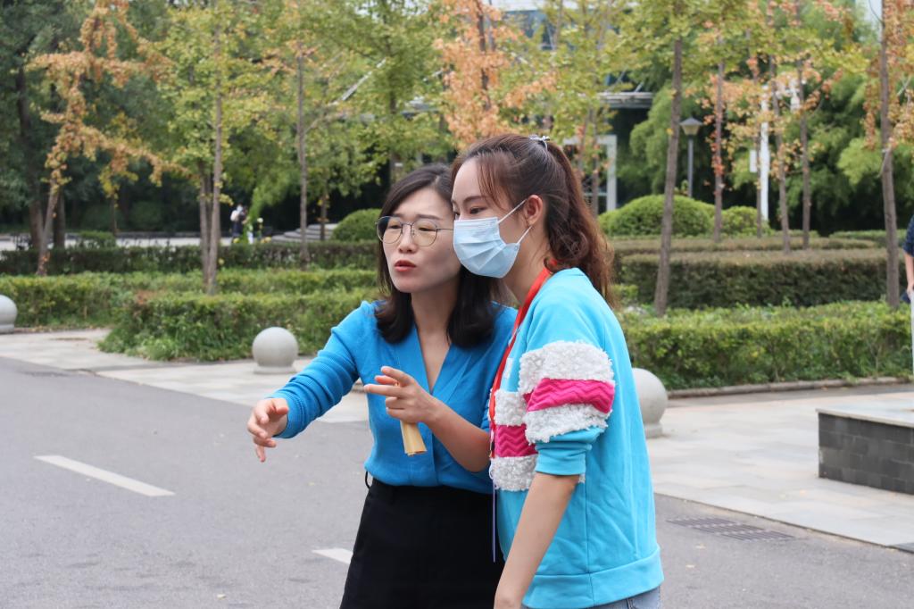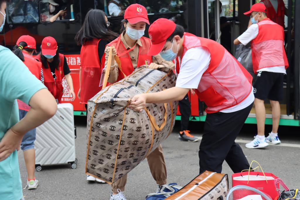 我院的迎新点位于大学生活动中心的斜前方,为了不让任何一位新生彷徨,我院的志愿者一直等候在下车点附近。每一辆满载新生的大巴车驶来时,车窗内那一双双既兴奋又胆怯的眼,便是志愿者们挥洒汗水的动力。“接过你的行囊,我们就是一家人。”等待许久的志愿者会在新生们下车的第一时间接过他们的行李,将他们送到寝室。