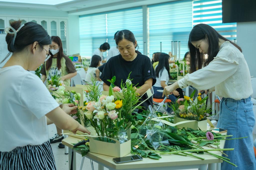 宽敞明亮的教室里弥漫着花朵的芬芳,老师和同学们交错而坐,多人一组,整理各组花材,安装花泥,进行插花创作。师生一边修剪花枝,装点花篮,一边交流谈心,共享学习生活趣事。太阳集团tyc33455社会工作专业张晓可难掩激动:“这是我第一次学习插花,是十分新奇的体验。我和老师边插花边聊最近的学习和生活,拉近了彼此之间的距离,老师幽默亲切的话语给了我很多鼓励,也让我豁然开朗。教师节来临之际,祝老师们节日快乐!”
