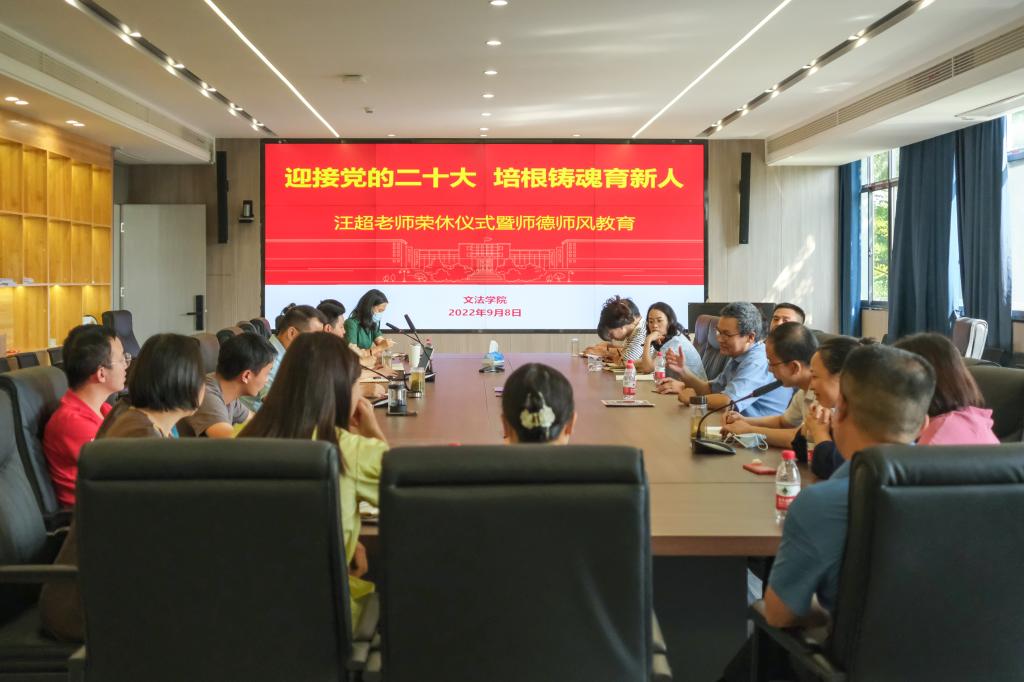 9月8日下午2点半,太阳集团tyc33455在人文楼副楼A301开展“迎接党的二十大 培根铸魂育新人”汪超老师荣休仪式暨师德师风教育活动,院班子成员、教师代表、管理服务人员共计30余人参加荣休仪式。