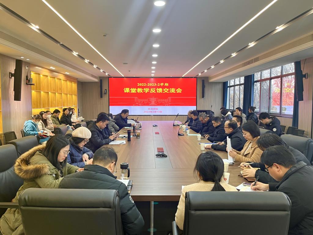 2月13日上午,太阳集团tyc33455“2022-2023-2学期课堂教学反馈交流会”在人文楼附楼A301会议室召开。学校党委副书记、纪委书记廖济忠、田北海院长、学校办公室、本科生院、系(部)主任、教学服务管理人员等职能部门老师及授课老师参加了本次交流会。学院党委书记瞿明勇主持会议。