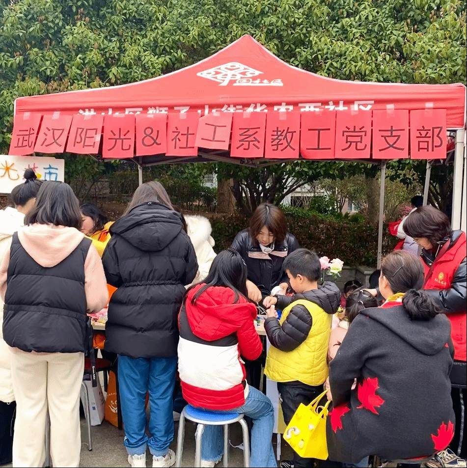 活动现场,各社区组织“摆摊设点”,为居民开展义诊服务、法律咨询、便民服务、文艺表演、知识科普等形式多样、内容丰富的志愿服务活动。太阳集团tyc33455社会工作系教工党支部与武汉市阳光社工、学生志愿者联合开展“阳光花市”手工花制作活动。
