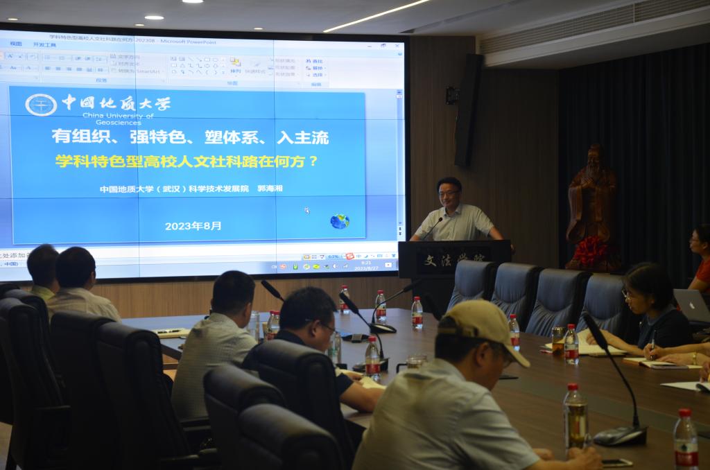 会上,郭海湘以“有组织、强特色、塑体系、入主流”为题,分享了中国地质大学在建设行业特色高校人文社科方面的经验做法。其中,重点介绍了近些年学校提出的一系列开展有组织科研的举措:构建“地学”特色的自主知识体系、搭建专业基地智库平台运营管理团队、出台智库成果的评价体系、加强国际交流、推进学科交叉融合、项目精准全覆盖等。