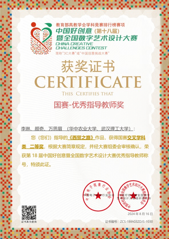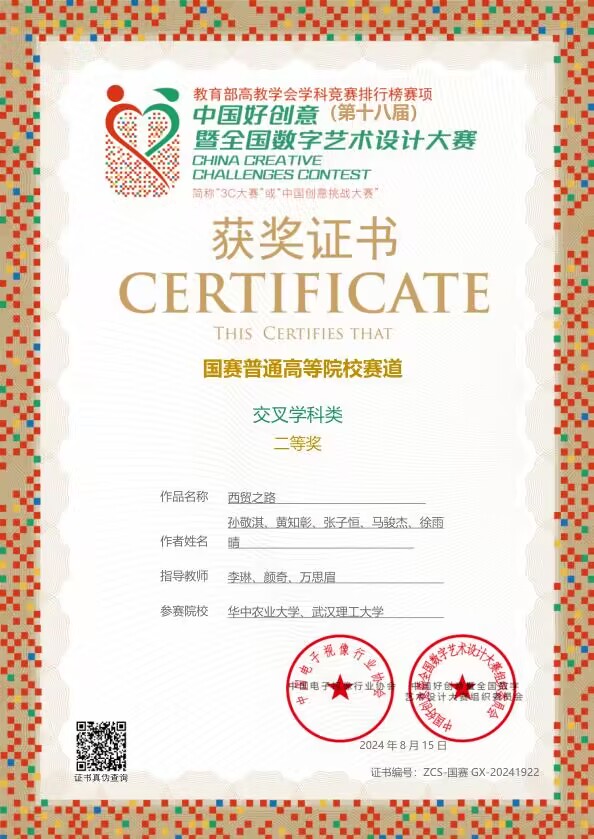 在好创意大赛中,我校艺术设计学生团队凭借《橘颂》作品荣获乡村振兴赛道国赛一等奖,该作品体现华农特色与助农本色;《西贸之路》作品荣获交叉学科赛道国赛二等奖,其作品主题涵盖”一带一路“人类命运共同体的中心思想;《古韵新触荆楚漆器纹样数字化交互设计》《开天辟地中国古代数学精粹》《"守艺.楚襄”书籍设计》荣获省级二等奖;《趣味荆楚-湖北省博文物图标设计》《四季》《"玉灵"原创绘本设计》荣获省级三等奖;景园设计学子《不期而愈》作品荣获空间设计赛道省级二等奖、《乐活旧脉智赋新生》荣获空间设计赛道省级三等奖。此次获奖是对我校艺术设计学子创新能力和实践能力的一次肯定,学校将继续秉承创新精神,以乡村振兴为主战场,不断创新“耕读”教育模式和方法,为培养更多服务乡村的“三全”人才作出积极贡献。
