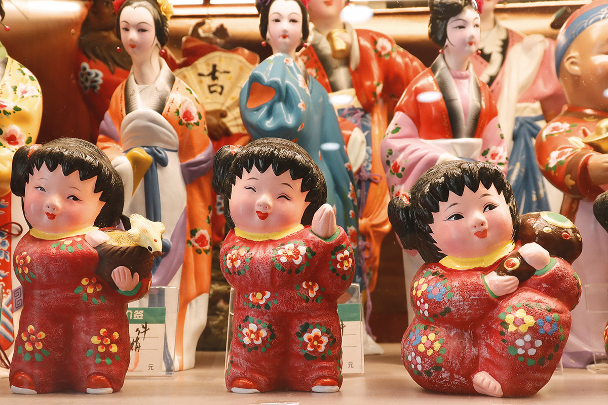 泥人张世家一直以来沿用着“一店一坊”的古老经营模式,以保证每一件作品的精工细作。世家店的售卖品分为两种,所捏造的均为传统人物。右侧展柜的陈列品主要为张宇先生制作的限量款泥塑和少量清宫旧藏。左侧展柜中的由张宇的助手完成主体部分,最后的“开眼”工作交由先生亲自完成。与右侧展品相比,左侧的泥塑较为通俗化,价格较为亲民。